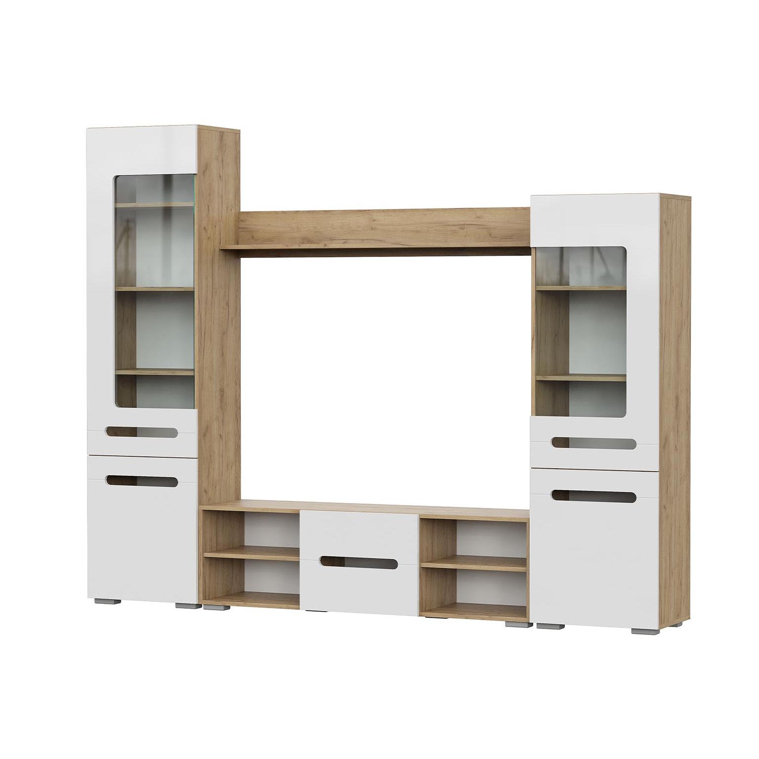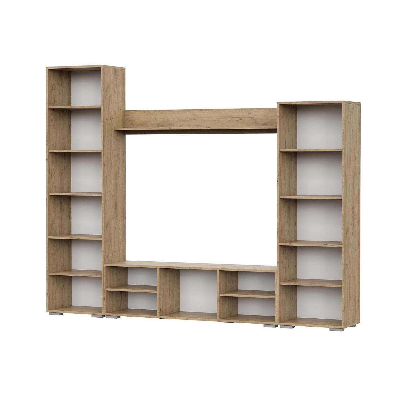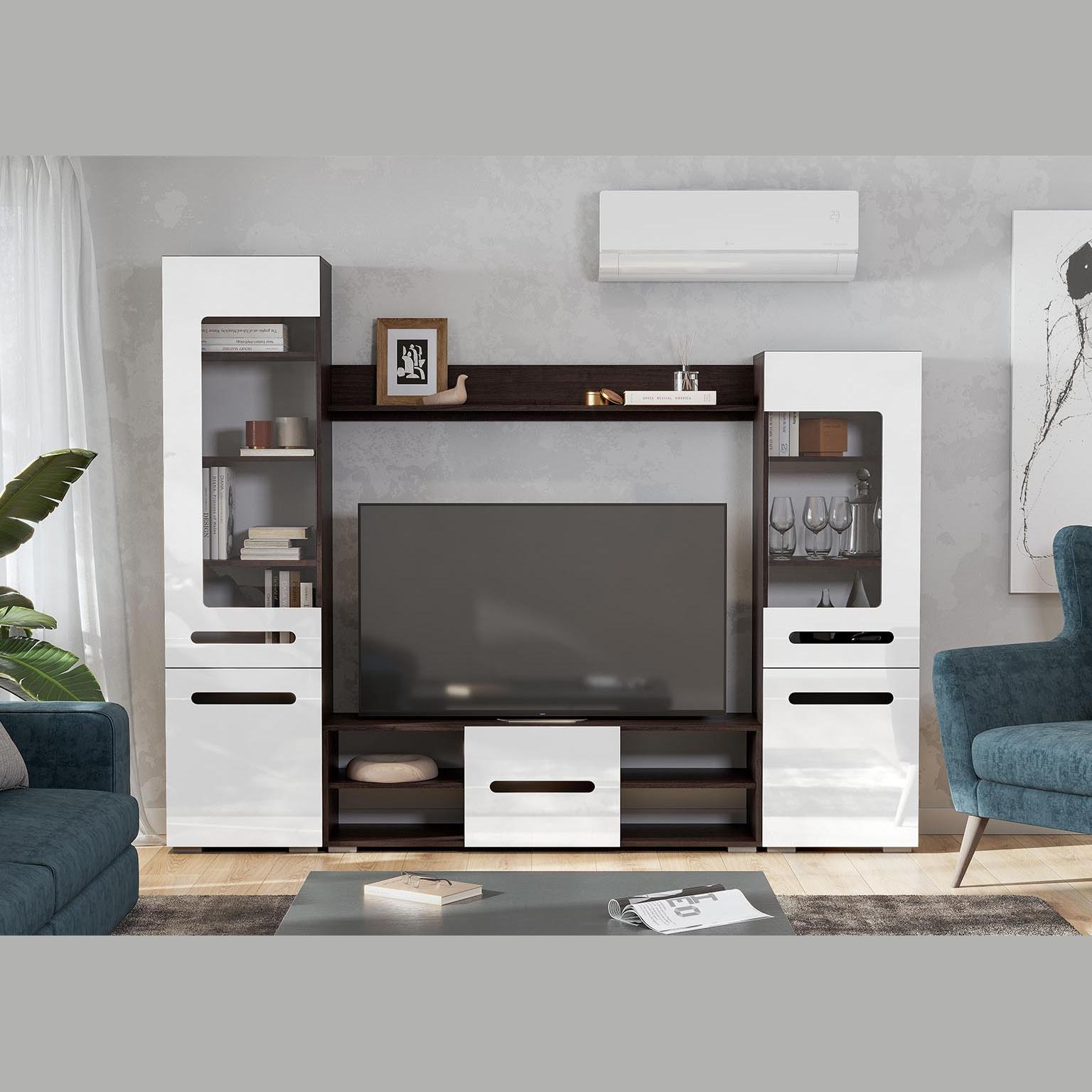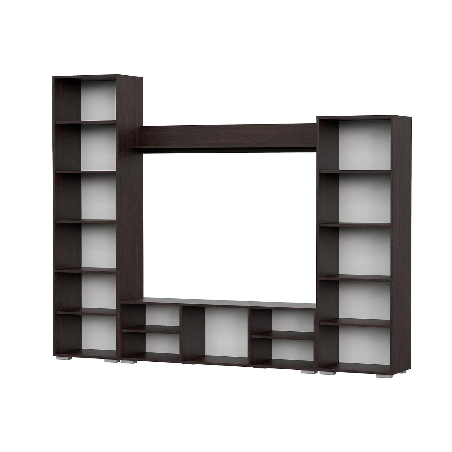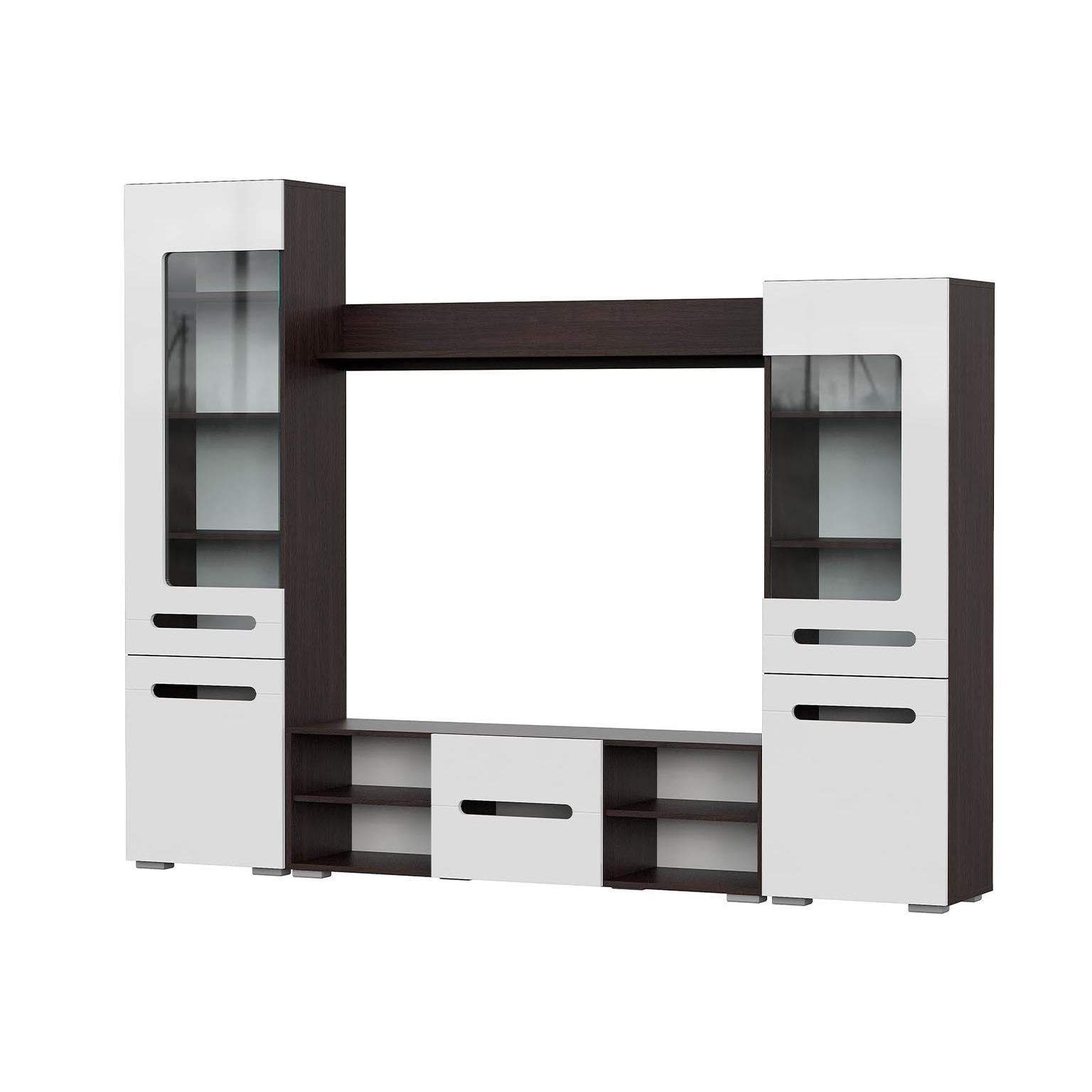 Гостиная МГС 6 состоит из двух пеналов-витрин, тумбы и навесной полки. Установка полностью универсальная, то есть, элементы можно ставить вплотную друг к другу или на расстоянии. При желании модули можно скрепить между собой, для этого используются меж секционные стяжки, которые покупаются отдельно. Чтобы предотвратить опрокидывание, рекомендуется также крепить к стене. Модули стоят на регулируемых пластиковых опорах без присадки на крепёж. Роль ручек у створок выполняют отверстия в фасадах. Эта гостиная зеркально не собирается.