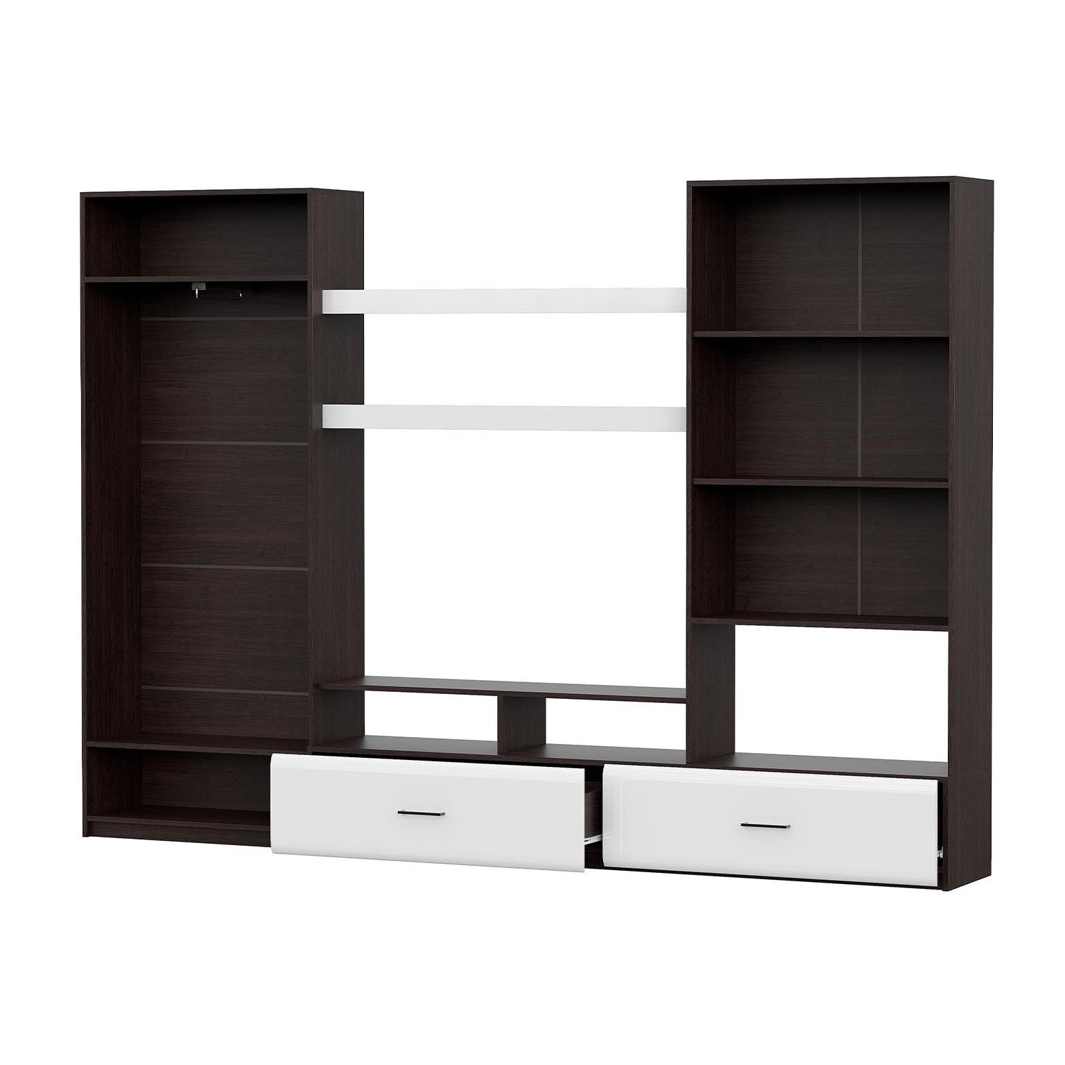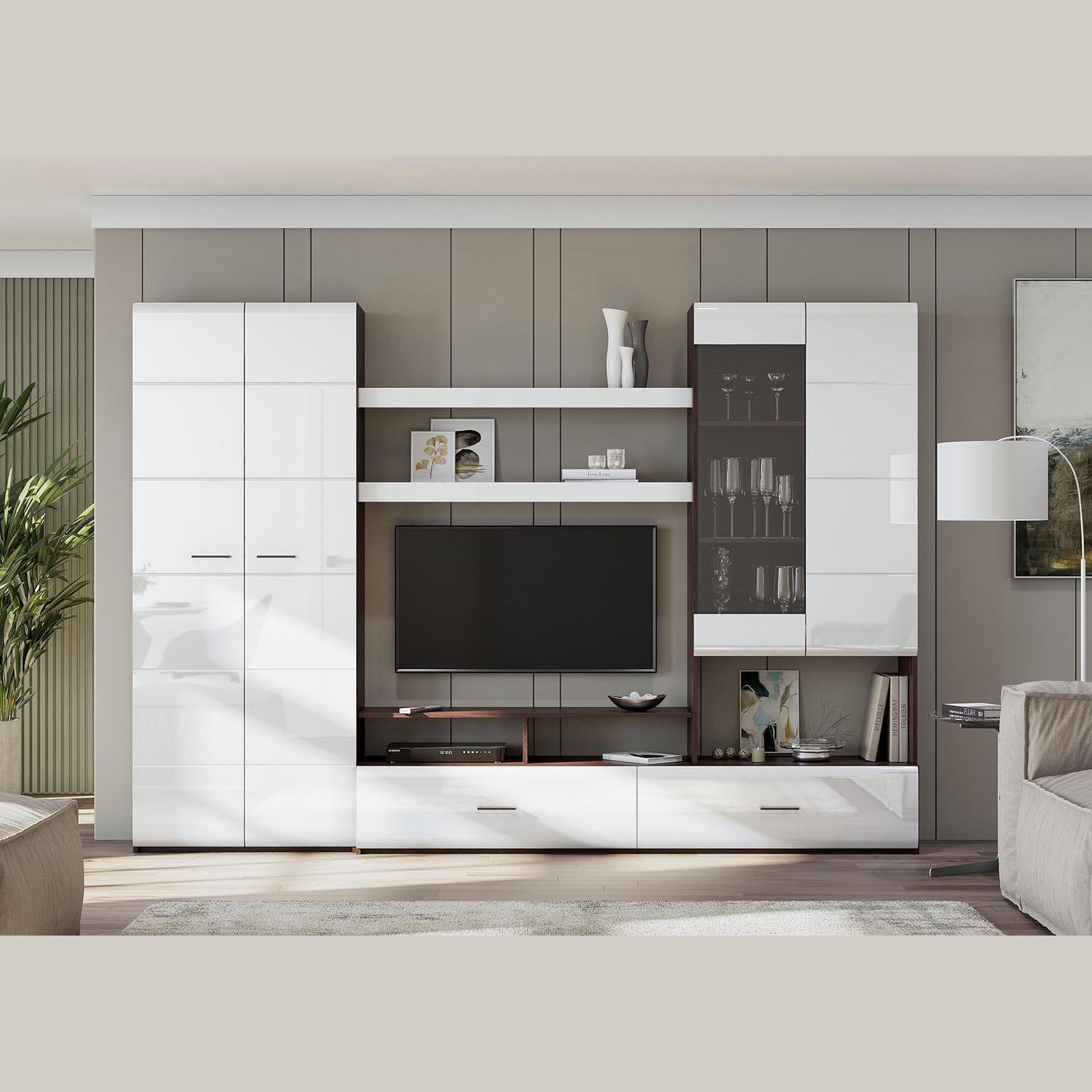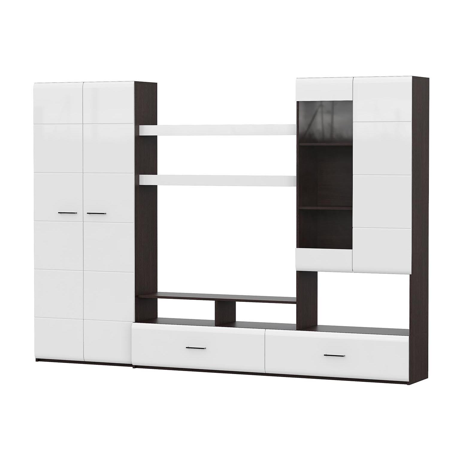 Гостиная МГС 7 — стенка в гостиную с фасадом «белый глянец» и корпусов в цвете «венге». Компактная, но при этом довольно вместительная гостиная позволит разместить ТВ в нише с размерами ШхВхГ 1200х758х300 мм, а посуду, книги и вещи на стеллажах.