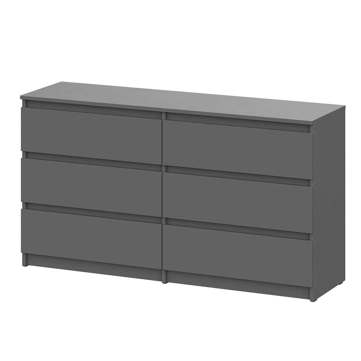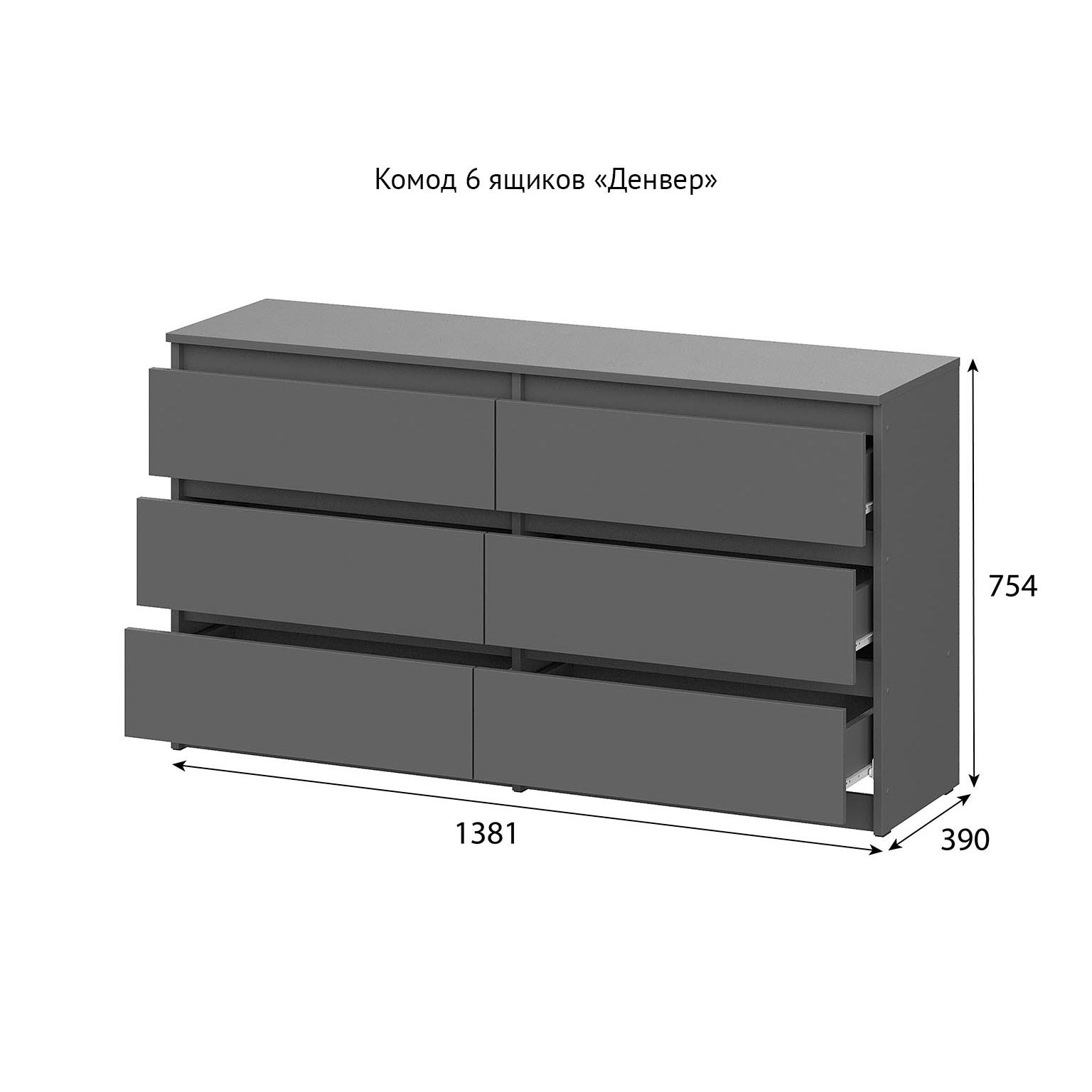 Комод «Денвер» имеет 6 ящиков с роликовыми направляющими без возможности установки доводчиков. Максимальная нагрузка на ящики — 5 кг. Комод изготовлен из высококачественного ЛДСП в цвете «Графит серый» и выполнен в минималистичном стиле, поэтому ящики не имеют ручек и открываются за выступающие торцы фасадов.