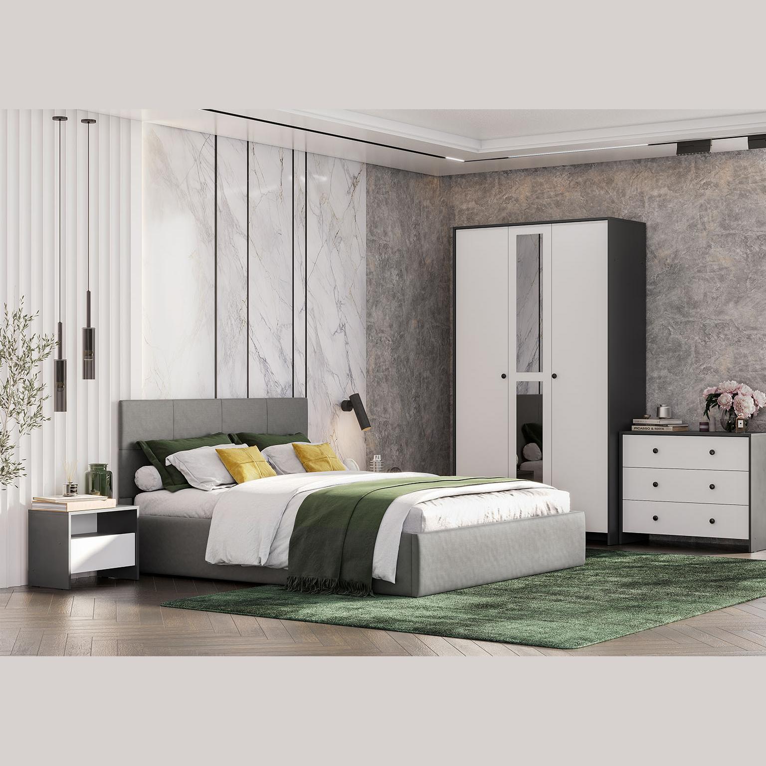 Кровать двойная №4 в размере 160 х 200 продаётся в комплекте с основанием под матрас! Эта кровать хорошо подходит к некоторым спальням, например в сером цвете под спальню «Дольче» в цвете графит.