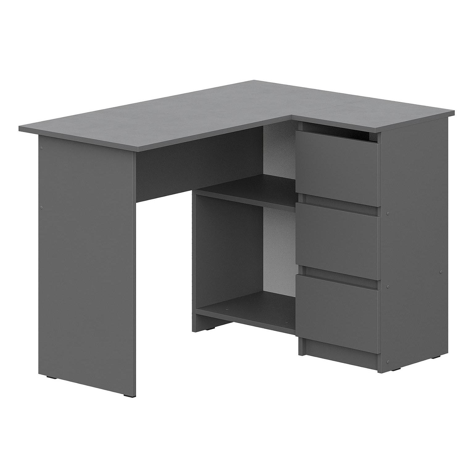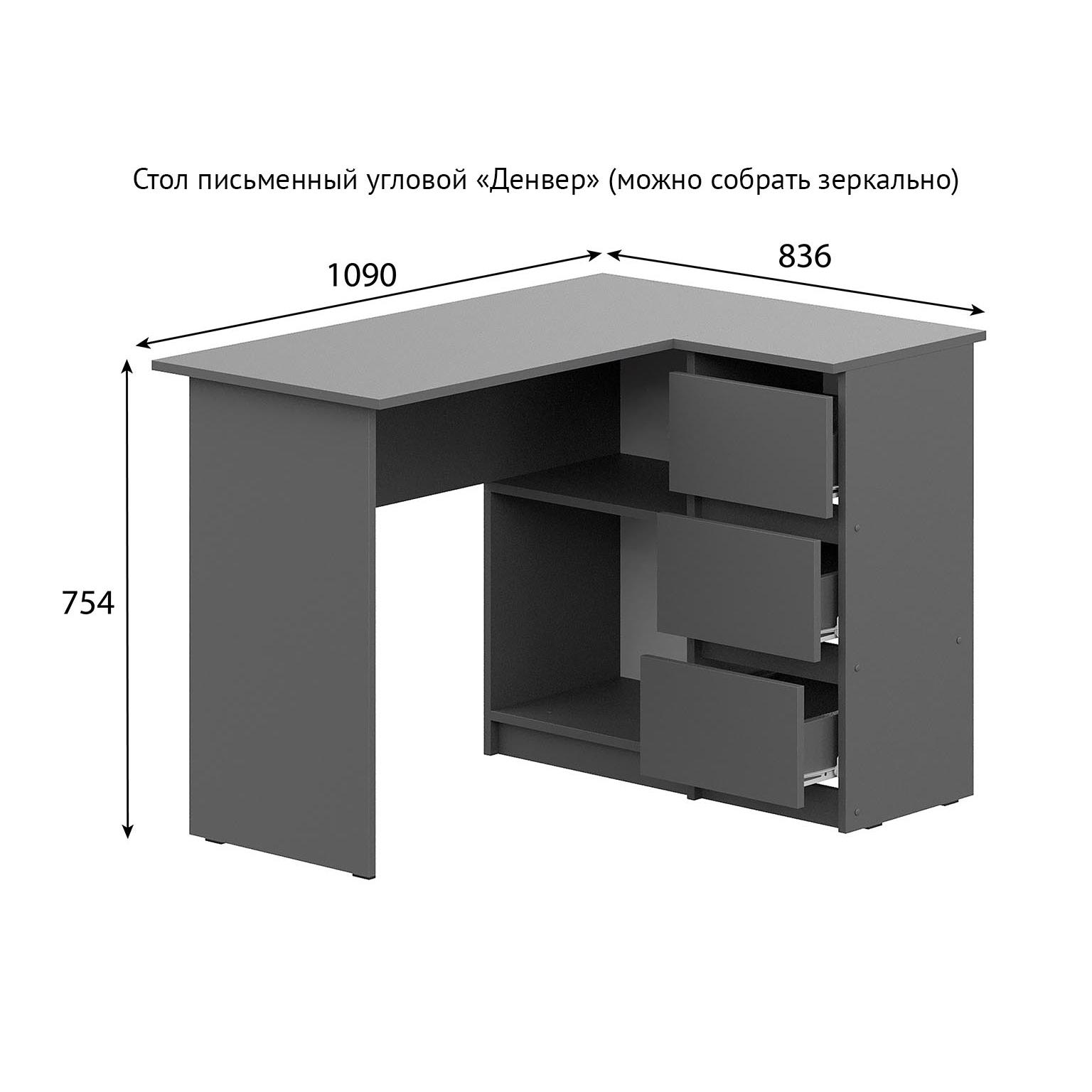 Стол письменный угловой Денвер имеет 3 выдвижных ящика, а также 2 полки. Сборка стола универсальная, поэтому тумбу можно собрать как на левую, так и на правую сторону. Сам стол изготовлен из высококачественного ЛДСП в цвете «Графит серый» и выполнен в минималистичном стиле, поэтому ящики не имеют ручек и открываются за выступающие торцы фасадов.