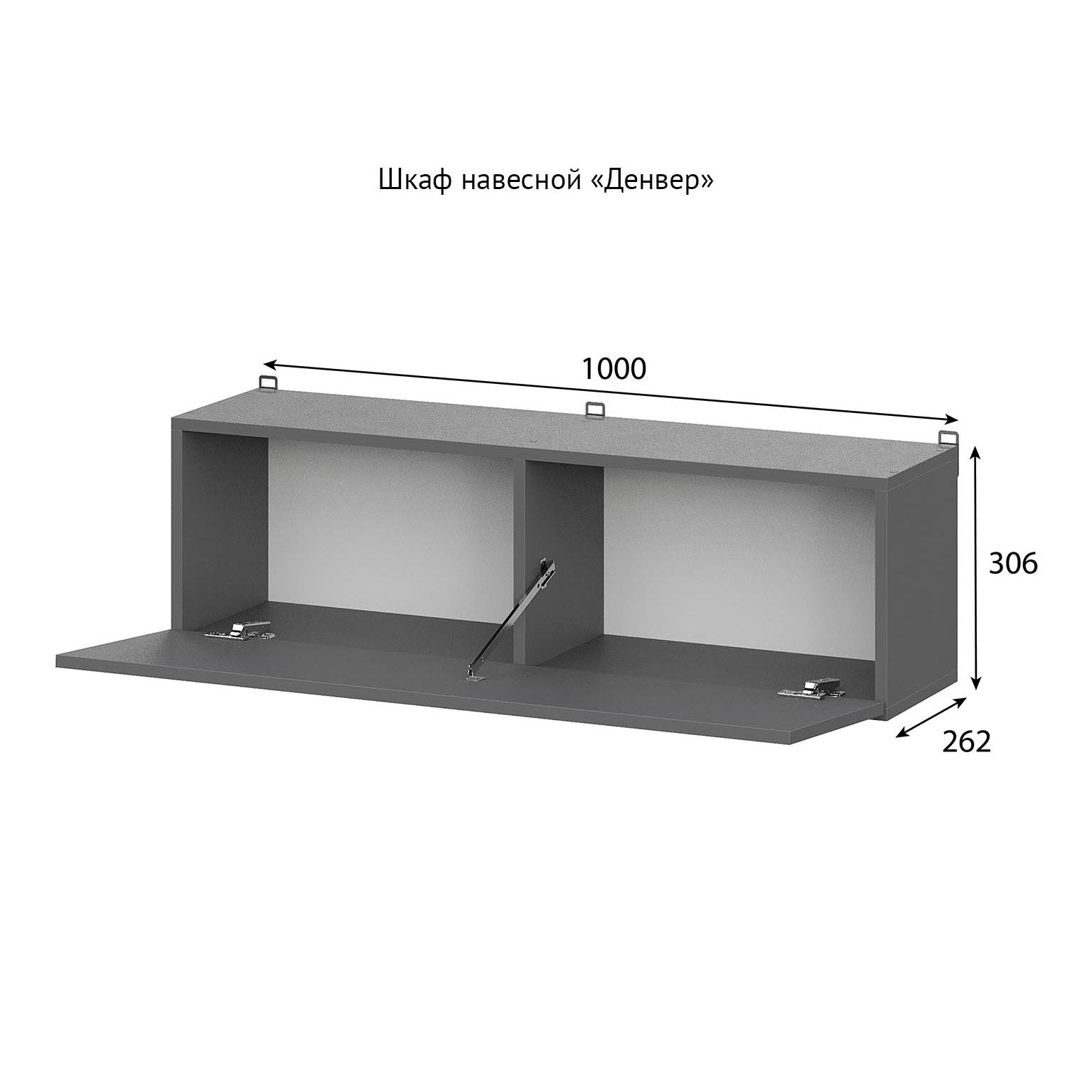 Шкаф навесной Денвер вешается на стену горизонтально или вертикально при помощи навесов. Шкаф изготовлен из высококачественного ЛДСП в цвете «Графит серый» и выполнен в минималистичном стиле, поэтому створка не имеет ручки и открывается за выступающий торец фасада.